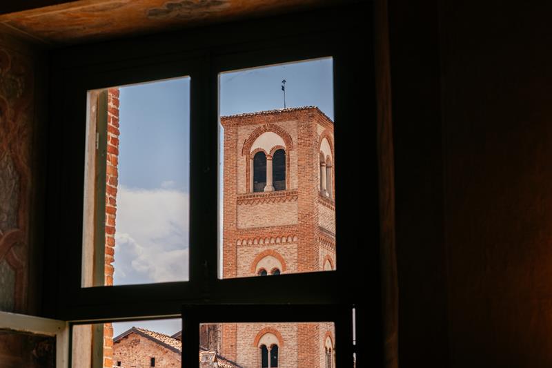 La torre, anch’essa recentemente ripulita da un posteriore intonaco, mostra in facciata un prezioso ed assai raro lunario con una scena boschereccia su cui, secondo le fasi, la luna sorge e tramonta. Sul lato sud, dopo i lavori di restauro, è apparsa un’elegante meridiana barocca.
