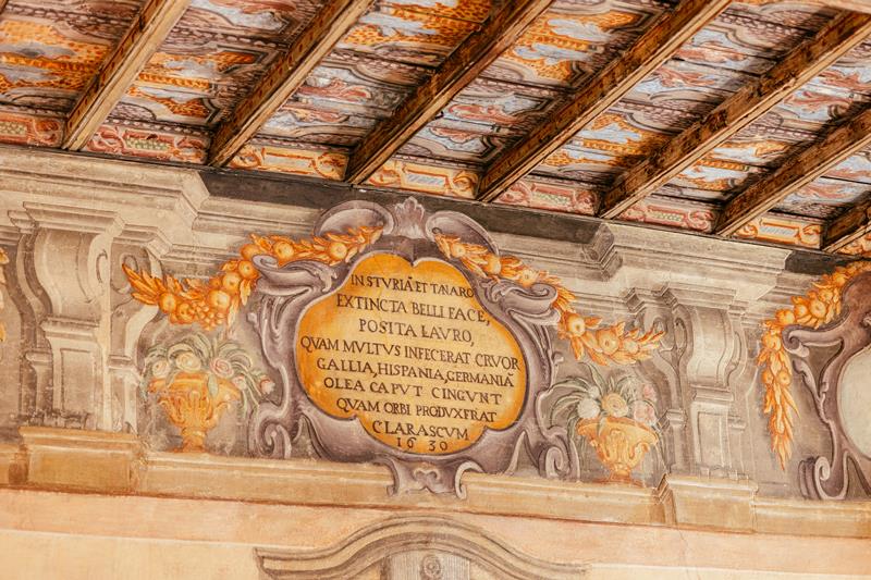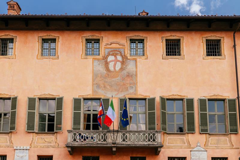 Sulla facciata esterna del Municipio, recentemente restaurato, si scorgono esempi significativi dell’antica e profonda cultura cittadina: arconi gotici, fregi e decorazioni quattro-cinquecentesche, l’affresco risalente al sec. XVIII in cui campeggia un fantastico ed originale stemma di Cherasco con un giovane ed una giovane – i fiumi Tanaro e Stura – che confondono i piedi nella confluenza di fondovalle. Lo stemma autentico della città è invece rappresentato da una croce rossa in campo bianco.