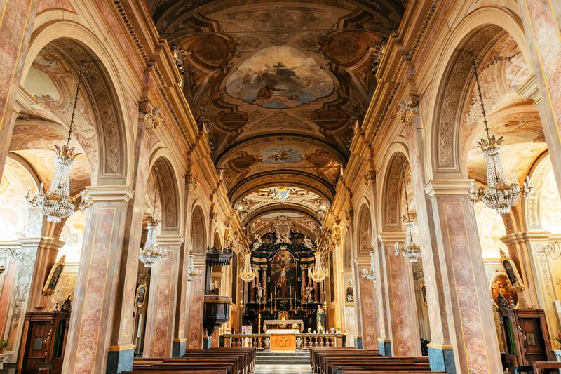 La chiesa ha subito rimaneggiamenti successivi quali lo sfondamento delle pareti laterali (le cappelle furono costruite nel ’700), l’apertura dei portoni e delle finestre quadrate ai lati. L’interno è completamente rifatto, tuttavia conserva un prezioso affresco nel campanile datato 1488 (ma probabilmente assai più antico) rappresentante una crocefissione, le quattro grandi tele del presbiterio e del coro (opera di Giovanni Taricco, nipote del più celebre Sebastiano, e di Giuseppe Ellena, entrambi cheraschesi).