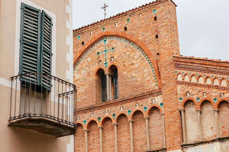 La Chiesa di S. Pietro è il monumento più antico della città (sec. XIII), costruito coi materiali della chiesa e del castello di Manzano. Secondo un modo di fare assai comune, gli abitanti di Cherasco utilizzarono materiale di diversa provenienza, così sulla facciata furono incastonate lapidi e sculture funerarie romane (provenienti da Pollenzo o da ritrovamenti cheraschesi), arenarie altomedioevali (dalla primitiva chiesa di Manzano), accanto a soluzioni classicamente romaniche o gotiche (loggiato ad archetti ciechi, tazze di maiolica verde).