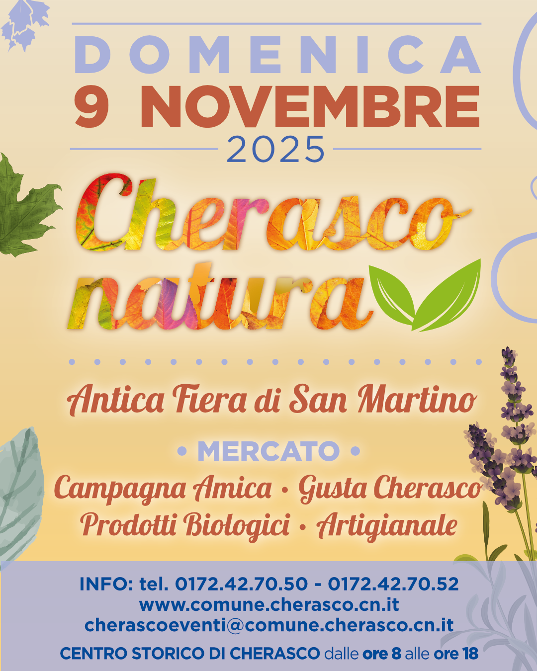 Domenica 9 novembre 2025 a Cherasco si terrà “Cherasco Natura”, il mercato che presenta prodotti di qualità alimentari e manufatti artigianali. La data è sempre in concomitanza alla festa di San Martino, un appuntamento che soprattutto in passato aveva un forte carattere contadino e popolare, legato al ciclo agricolo e vinicolo.